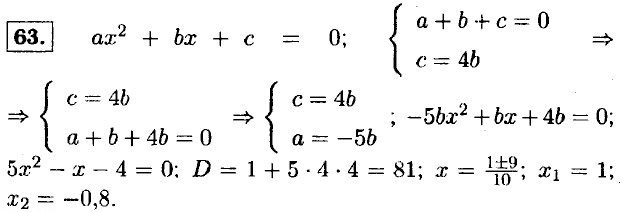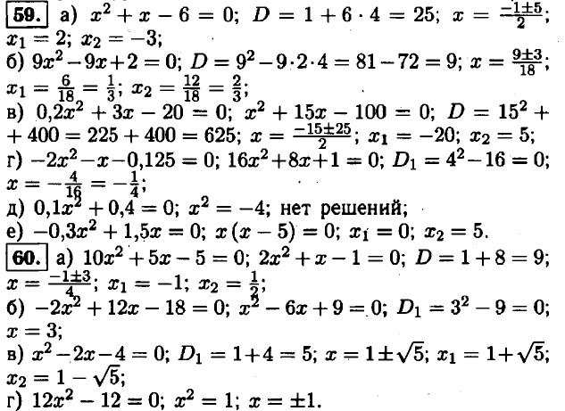 61. а) 5х2 - 8х + 3 = 0; D1 = 42 - 5 • 3 = 16 - 15 = 1 > 0; уравнение имеет два корня; б) 9х2 + 6х + 1 = 0; D1 = 32 - 9 = 0; уравнение имеет один корень; в) -7х2 + 6х - 2 = 0; D1 = 32 - 7 • 2 = 9 - 14 = -5 < 0; уравнение не имеет корней; г) -х2 + 5х - 3 = 0; D = 25 - 4 • 3 = = 25 - 12 = 13 > 0; уравнение имеет два корня. 62. а) -4х2 - 4х + 3 = 0; D1 = 22 + 4 • 3 = 4 + 12 = 16 > 0; уравнение имеет два корня; б) 4х2 - 4х + 3 = 0; D1 = 22 - 3 • 4 = 4 - 12 = -8 < 0; уравнение не имеет корней; в) 9х2 - 12х + 4 = 0; D1 = 62 - 4 • 9 = 36 - 36 = 0; уравнение имеет один корень; г) 9х2 - 12х • 4 = 0; D1 = 62 + 4 • 9 = 36 + 36 = 72 > 0; уравнение имеет два корня.