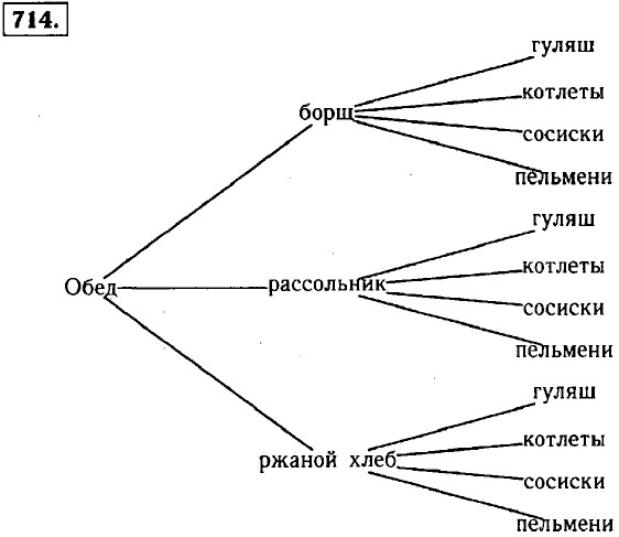 718. a) 16, 18, 61, 68, 81, 86; б) 30, 34, 40, 43. 719. a) 12, 13, 21, 23, 31, 32; б) 11, 12, 13, 21, 22, 23, 31, 32, 33. 720. 204, 206, 240, 246, 260, 260, 264, 402, 406, 420, 426, 460, 462, 602, 604, 620, 624, 640, 642. 721. 8 + 7 + 6 + 5 + 4 + 3 + 2 + 1 = 36 партий. 722. 2 • 11 + 2 • 10 + 2 • 9 + 2 • 8 + 2 • 7 + 2 • 6 + 2 • 5 + 2 • 4 + 2 • 3 + 2 • 2 + 2 • 1 = 2 (11 +10 + • • • + 2 + 1) = 132 игры. 723. 7 + 6 + 5 + 4 + 3 + 2 + 1 = 28 рукопожатий 724. Каждый ученик отдаст 24 - 1 = 23 учащимся свою фотографию. Значит, потребуется 24 • 23 = 552 фотографии. 725. Для каждой цифры существует всего 10 различных ходов, всего кодов 10 • 10 = 100.100 > 96. Кодов хватит для всех квартир. 726. 3 • 4 = 12 способов. 727. 3 • 5 • 2 = 30 способов. 728. 5 • 6 • 3 • 2 = 180 костюмов.