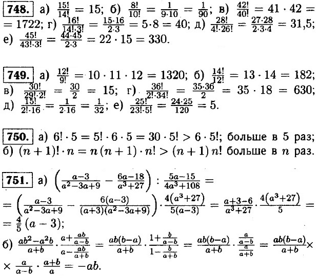 § 11. Элементы комбинаторики Перестановки732. 4 • 3 • 2 • 1 = 4! = 24 способами. 733. 7! = 5040 маршрутов. 734. 9! = 362880 способами. 735. Исходное выражение не нужно учитывать 5! - 1 = 120 - 1 = 119 выражений. 736. 3! = 6 вариантов. 737. a) 6! = 720 чисел; 6) 6! - 5! = 720 - 120 = 600 чисел. 738. a) 3! = 6 чисел; б) Чтобы число было кратно 15 необходимо, чтобы оно было кратно 3 и 5. Любое составленное число кратно трем, так как сумма цифр его 24 кратно 3. Составленное число кратно 5, если оно оканчивается на 5, значит, таких чисел 3! = 6. 739. Всего таких чисел 4! = 24, поэтому сумма цифр равна 24 (1 + 3 + 5 + 7) = 24 • 16 = 384. 740. а) Составленные числа буду больше 3000, если они будут начинаться с 3 или 4. Всего различных чисел начинающихся с 3 будет 3! = 6, а с 4 - 3! = 6. Всего 6 + 6 = 12; б) Составленные числа буду больше 2000, если они будут начинаться с 2, 3 или 4. Всего различных чисел начинающихся с 2 будет 3! = 6, а с 3 - 3! = 6, с 4 - 3! - 6. Всего 6 + 6 + 6 = 18. 741. а) 6! = 720; б) 5! = 120; в) Всего 6 таких мест, когда Олег и Игорь стоят рядом, число возможных комбинаций размещения их 12. Остальные мальчики стоят в произвольном порядке, тогда всего различных расположений 12 • 5! = 12 • 120 = 1440. 742. Всего 5 различных способов двух предметов рядом. Так как нам не важно, что в первое алгебра или геометрия, то различных способов размещения их 10. Остальные предметы расставлены в произвольном порядке, значит всего 10 • 4! = 240 способов. 743. 3 • 2! = 6. 744. Последний из 5 сборников может стоять на 5, 6, 7, 8, 9, 10, 11 или 12 месте. Всего различных расположений сборников 8 • 5! = 960. А остальные книги стоят в произвольном порядке, поэтому всего способов 960 • 7! — 4838400 способов. 745. а) 10! = 3628800 способами; б) 5! • 5! = 14400 способами. 746. а) 90 = 9 • 10 делится; б) 92 = 4 • 23 делится; в) 94 = 2 • 47 не делится; г) 96 = 6 • 16 делится. 747. a) 168 = 3-7-8 делится; б) 136 = 8-17 не делится; в) 147 = 3 • 7 • 7 < 3 • 7 • 14 делится; г) 132 = 3 • 4 • 11 делится.