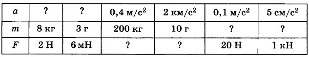 143. Заполнить таблицу, где а ускорение, которое приобретает тело массой m под действием силы F.