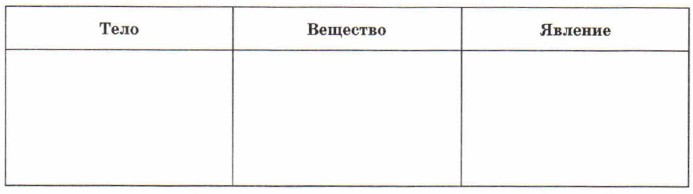 1.22. Опишите, какими основными физическими явлениями сопровождается выстрел из артиллерийского орудия. 1.23. Опишите, какими основными физическими явлениями сопровождается старт ракеты с поверхности Земли. 1.24. Начертите в тетради приведенную ниже таблицу. Определите, какие из перечисленных ниже слов обозначают физическое тело, какие — вещество и какие — явление и запишите их в соответствующую колонку: мел, молния, рассвет, капля воды, Луна, выстрел, циркуль, ртуть, мед, наводнение, молоко, авторучка, лед, таяние льда, вьюга, вода.