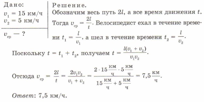 Велосипедист первую половину пути ехал по прямой дороге со скоростью 15 км/ч, а вторую половину пути (из-за прокола шины) шел пешком со скоростью 5 км/ч. Определите среднюю скорость движения велосипедиста.