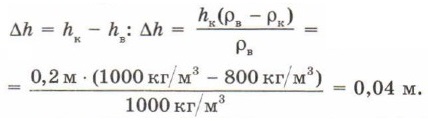 21.45. В левом колене уровень жидкости выше на 4 см. Решение. Во всех точках одной и той же жидкости, лежащих на одном уровне, давление одинаково (иначе происходило бы перетекание жидкости). Приравнивая давление в точках А и В (рис. 258), получаем ρKghK = ρBghB. Отсюда Таким образом, слева уровень жидкости выше. Найдем разность уровней