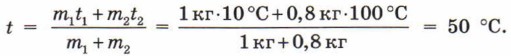 Удельная теплоемкость. Уравнение теплового баланса Удельная теплоемкость. Уравнение теплового баланса: Ответы, указания, решения4.5. У медной. 4.13. На нагревание воды. 4.14. Из-за большой удельной теплоемкости воды. 4.15. 25,2 кДж. 4.16. 24 г. 4.17. 4.18. 420 °С. 4.19. 60 °С. 4.20. На 75 °С. 4.21. Если опустить алюминиевую ложку. 4.22. Главная причина — масса кирпичной печи намного больше, чем железной. 4.23. После дождя в почве много воды, у которой большая удельная теплоемкость. Кроме того, при испарении происходит охлаждение почвы. 4.27. Малой удельной теплоемкостью песка. 4.28. 1,2 МДж. 4.29. 720 кДж. 4.30. 50 °С. Решение. В теплопередаче участвуют два тела: холодная вода получает количество теплоты Q1 = cm1(t - t1), кипяток отдает количество теплоты Q2 = cm2(t2 - t). Здесь с — удельная теплоемкость воды, t = 100 °С. Согласно уравнению теплового баланса Q1 = Q2. Следовательно, cm1(t - t1) = cm2(t2 - t), откуда