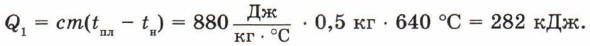 Пример решения задачи Алюминиевому бруску массой m = 500 г при температуре tн = 20 °С передали количество теплоты Q = 450 кДж. Какой станет температура алюминия? Р е ш е н и е. Определим сначала количество теплоты, которое потребуется для нагревания алюминия до температуры плавления: