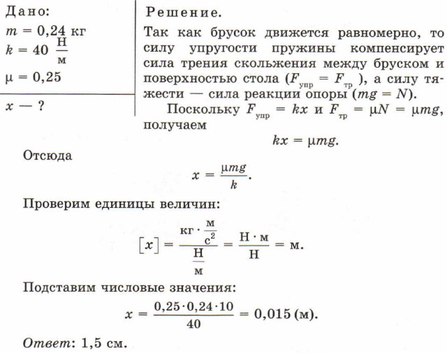 Пример решения задачи С помощью пружины тянут равномерно и прямолинейно деревянный брусок массой 240 г по горизонтальной поверхности стола (рис. 107). Коэффициент трения между бруском и столом равен 0,25. Определите удлинение пружины жесткостью 40 Н/м, если во время движения пружина горизонтальна.
