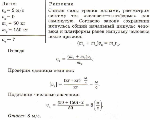 Пример решения задачи Когда человек спрыгнул с платформы, двигавшейся со скоростью 2 м/с, платформа остановилась. Какую скорость относительно Земли приобрел человек при прыжке, если его масса 50 кг, а масса платформы — 150 кг?