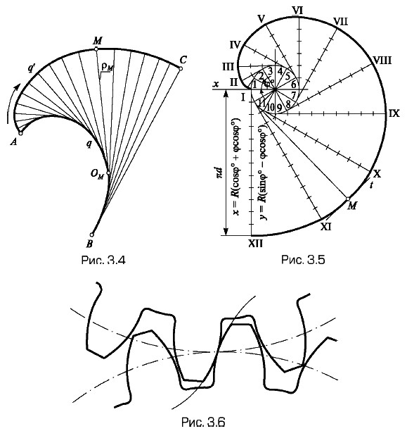 Кривые линии и их применение в чертежах Плоские кривые линииКривую линию называют плоской, если все точки линии лежат в одной плоскости, и пространственной, если точки не принадлежат одной плоскости. Примеры плоских кривых — эвольвента, циклоида, спираль Архимеда, синусоида; кривые второго порядка — эллипс, гипербола, парабола, различные овалы и другие; примеры пространственных кривых — винтовая линия, линия пересечения боковых поверхностей прямых круговых цилиндра и конуса, оси которых не пересекаются. Рассмотрим некоторые из них, применяемые в конструкциях деталей. Построение эвольвентыЭвольвентой q' называется кривая, которую описывает точка M прямой ρM линии, катящейся без скольжения по неподвижной кривой q (эволюте) AB (рис. 3.4). Центр OM радиуса кривизны ρM точка M. Эвольвента окружности широко (рис. 3.5) применяется в технике для выполнения зубчатых колес (рис. 3.6). Утолщенной линией выделены участки профилей зубьев, выполненных по эвольвенте. Построение эвольвенты окружности выполняют следующим образом (см. рис. 3.5). Окружность делят на n равных частей, например 12, в точках делений проводят полукасательные и откладывают на последней, 12-й полукасательной отрезок, равный длине окружности. Отрезок делят на п равных частей. На 11-й полукасательной откладывают 11 частей отрезка, на 10-й — 10 и т.д. Через полученные точки проводят с помощью лекала плавную кривую. На рисунке показано построений касательной в произвольной точке M эвольвенты.