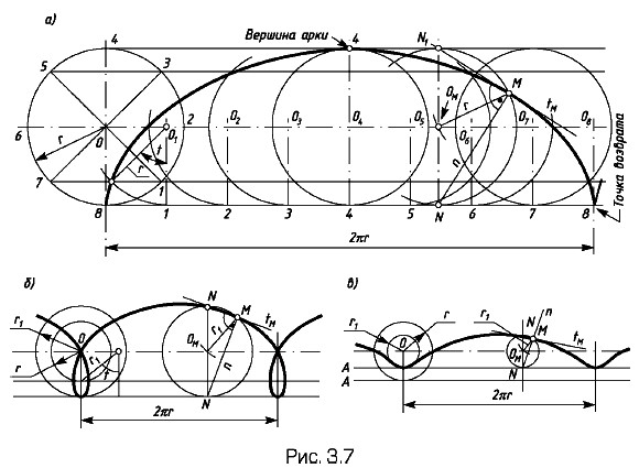 Построение циклических кривых (греч. цикл — колесо, круг). Эти кривые составляют обширный класс кривых, образованных траекториями точек плоскости круга, катящегося без скольжения по какой-либо компланарной с ним направляющей линии. Если эта линия — прямая, траектории точек — обыкновенная циклоида (рис. 3.7, а); укороченная циклоида — точки лежат внутри круга (рис. 3.7, б); удлиненная циклоида — точки лежат вне круга (рис. 3.7, в).