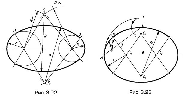 Кривые линии и их применение в чертежах СопряженияПостроение оваловОвал — это фигура, состоящая из двух опорных окружностей, внутренне сопряженных дугами. Построение овала с опорными окружностями разных диаметров (рис. 3.22) сводится к построению выпуклого сопряжения двух дуг (см. рис. 3.23) двумя дугами одинакового радиуса из центров С1 и С2. Такой овал имеет одну ось симметрии. Если опорные окружности одинакового диаметра, то овал имеет две оси симметрии.