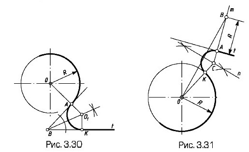 Задана точка сопряжения А на окружности (рис. 3.30 — внешнее касание). Центр дуги сопряжения — точка пересечения луча ОА, проведенного через точку сопряжения А и центр заданной окружности, и биссектрисы угла ABK, образованного касательной АВ в точке сопряжения и заданной прямой t. Радиус сопрягающей дуги равен расстоянию O1A; O1K⊥t, где K — точка сопряжения на прямой t.