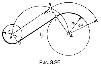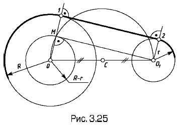 Касательная к двум дугам (R и r, рис. 3.25, внешнее касание). Проводят дугу радиуса R - r из центра О дуги большего радиуса. Строят касательную MO1 к этой дуге, проходящую через центр дуги меньшего радиуса (