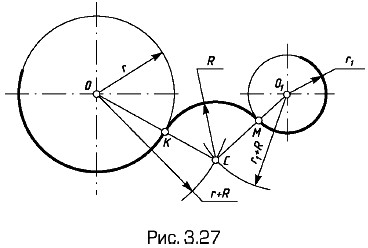 Сопряжение двух дуг вогнутое (рис. 3.27). Радиус сопряжения R; центр (С) = (circ (r + R)) Точки сопряжения (1) = (circ r)
