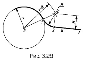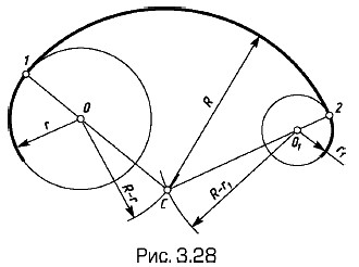Сопряжение двух дуг выпуклое (рис. 3.28). Радиус сопряжения R; центр (C) = (circ (R - r)) Точки сопряжения (1) = (circ r)