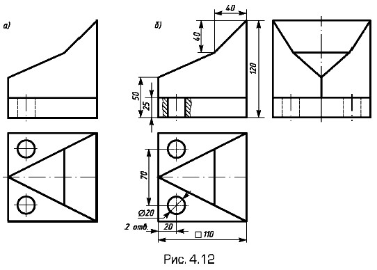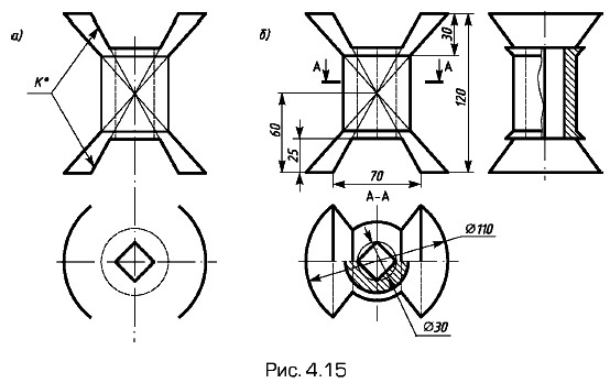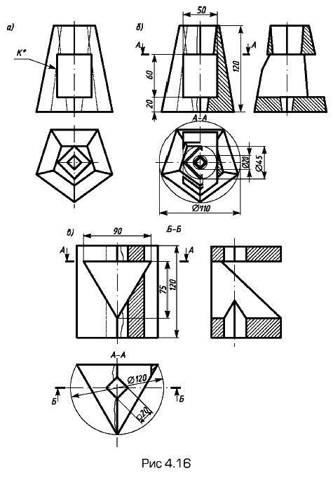 В этом случае применен ступенчатый размер A — A, который позволил выявить сквозной характер одного из четырех отверстий ∅12. Тонкое ребро толщиной 10 мм на главном виде в разрезе показано незаштрихованным. Также нерассеченными при продольном разрезе показывают такие детали, как винты, заклепки, шарики, шпонки, непустотелые валы, рукоятки. Особенность задачи 4 (рис. 4.15, а, б) и последующих — наличие призматического отверстия, которое следует вычертить в исходной фигуре. Основа решения этой задачи — построение линий пересечения поверхностей исходной фигуры с гранями призматического отверстия и формирование его внутренней полости. Исходные фигуры задачи, как правило, многогранники или комбинации многогранников с прямым круговым цилиндром или конусом. Задачи составлены таким образом, что все линии пересечения поверхностей — прямые. Выполнение разрезов, выбор положения секущих плоскостей диктуются формой и положением призматического отверстия.