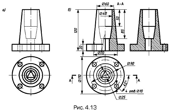 В задаче 2 (рис. 4.13, а, б) построение вида слева для более сложной фигуры, составленной из тех же простейших поверхностей с наличием внутренних полостей и сквозных отверстий. Линии пересечения представляют простейшие случаи. Задача требует выполнения простых разрезов, в том числе и для отверстий, расположенных по окружности на круглом фланце. Это отверстие (справа) переносится в секущую плоскость A — A мысленно (условно) с расположением оси на своем диаметре ∅90. Секущая плоскость A — A обозначена в связи с несимметричностью детали относительно ее.