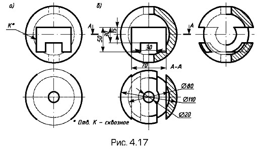 В данном случае и далее (см. рис. 4.14, 4.15, 4.16, 4.17) сохранены штриховые линии на видах, хотя выполненные разрезы вполне позволяют представить (прочитать) форму деталей. Они сохранены только в учебных целях. Отверстия ∅10 на круглом фланце указаны лишь условно осевой линией на главном виде. В задаче 3 (рис. 4.14, а, б) построение вида слева для фигуры, приближенной к реальным техническим деталям, где предусмотрено наличие прямоугольного фланца с отверстиями, вынесенными из плоскости симметрии фигуры. Обязательными элементами конструкции фигуры являются тонкие стенки, перегородки, ребра жесткости. Линии пересечения — простейшие случаи. Разрезы — простые и сложные (ступенчатые). Здесь еще рассматривается применение условностей изображения ребер жесткости в разрезе.