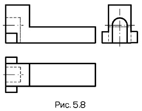 Изображения. Надписи. Обозначения ВидыНазвания основных видовДля видов, получаемых на основных плоскостях проекций (основные виды, см. рис. 5.2), установлены следующие названия: 1 — вид спереди (главный вид); 2 — вид сверху; 3 — вид слева; 4 — вид справа; 5 — вид снизу; 6 — вид сзади. Названия видов на чертежах не подписывают, если их расположение относительно главного вида (изображения) соответствует рис. 5.2. Если виды сверху, слева, справа, снизу, сзади смещены относительно главного изображения (вида или разреза, изображенных на фронтальной плоскости проекций), то направление взгляда указывают стрелкой, обозначаемой прописной буквой, а соответствующие виды отмечают на чертеже надписью по типу А. Чертеж оформляют так же, если перечисленные виды отделены от главного изображения другими изображениями или расположены не на одном листе с ним. Когда отсутствует изображение, на котором может быть показано направление взгляда, название вида надписывают. Для уменьшения количества изображений допускается на видах показывать необходимые невидимые части поверхности предмета штриховыми линиями. В качестве примера на рис 5.8 приведены три основных вида детали призматической формы. На двух видах — главном и виде сверху — штриховыми линиями показана форма выемки в левой части детали. На виде слева штриховыми линиями уточнена форма правой части детали.