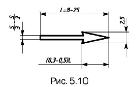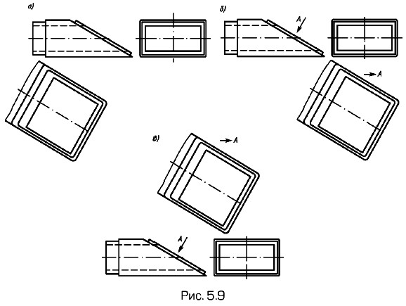 Дополнительный вид, Развернутый видЕсли какую-либо часть предмета невозможно показать на рассмотренных выше основных видах (см. рис. 5.2) без искажения формы и размеров, то применяют дополнительные виды, получаемые на плоскостях, не параллельных основным плоскостям проекций. Варианты расположения дополнительного вида на примере прямоугольного волновода показаны на рис. 5.9, а — в, при этом расположения а или б предпочтительнее. Дополнительный вид отмечают на чертеже надписью типа А (рис. 5.9, б, в), а у связанного с дополнительным видом изображения предмета ставят стрелку, указывающую направление взгляда, соответствующими буквенными обозначениями (стрелка А, рис. 5.9, б, в). Соотношение размеров для вычерчивания стрелок приведено на рис. 5.10.