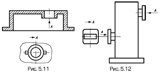 Когда дополнительный вид расположен в непосредственной проекционной связи с соответствующим изображением, стрелку и надпись над видом не наносят (см. рис. 5.9, а). Местный видИзображение отдельного, ограниченного места поверхности предмета называют местным видом. Местный вид может быть ограничен линией обрыва, по возможности в наименьшем размере (А на рис. 5.11), или не ограничен (А на рис. 5.12). Местный вид отмечают на чертеже подобно дополнительному виду.
