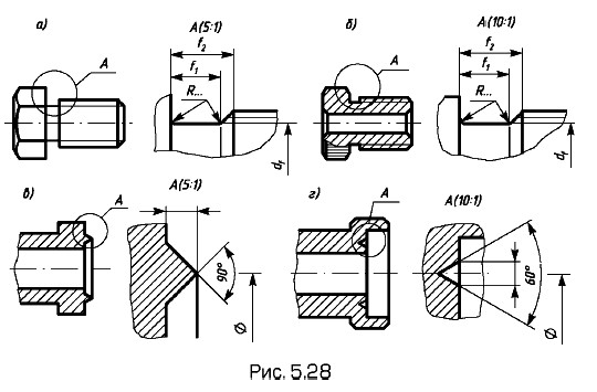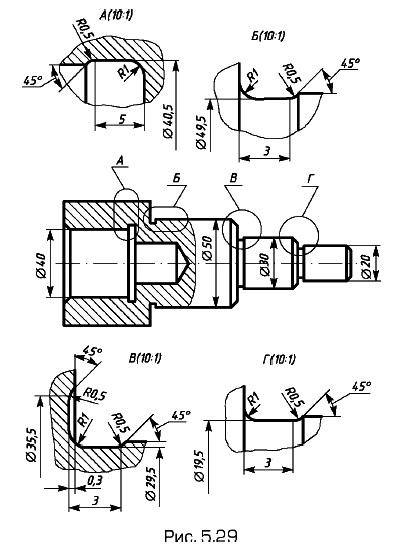 Изображения. Надписи. Обозначения Выносные элементыВыносной элемент — это дополнительное отдельное изображение (обычно увеличенное) какой-либо части предмета, требующей графического и других пояснений в отношении формы, размеров и иных данных. Выносной элемент может содержать подробности, не указанные на соответствующем изображении, и может отличаться от него по содержанию (например, изображение может быть видом, а выносной элемент — разрезом). При применении выносного элемента соответствующее место отмечают на виде, разрезе или сечении замкнутой сплошной тонкой линией, окружностью, овалом и т.п. с обозначением заглавной буквой выносного элемента на полке линии-выноски. У выносного элемента указывают эту букву и масштаб по типу А (5:1) (рис. 5.28, а, б). На рис. 5.28, б выносной элемент выполнен как вид, на изображении детали ему соответствует разрез. На рис. 5.28, в, г приведены выносные элементы, показывающие конструкцию канавки и зуба разборного вакуумно-плотного соединения со схемой нанесения размеров. Другой пример выполнения выносных элементов — канавок для выхода шлифовального круга — приведен на рис. 5.29. Выносной элемент располагают возможно ближе к соответствующему месту на изображении предмета.