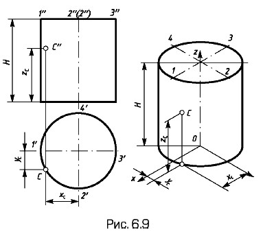 При построении изометрического изображения от руки (как рисунка) эллипс выполняют по восьми точкам. Например, по точкам 1, 2, 3, 4, 5, 6, 7 и 8 (см. рис. 6.8). Точки 1, 2, 3 и 4 находят на соответствующих аксонометрических осях, а точки 5, 6, 7 и 8 строят по величинам соответствующих большой и малой осей элипса. При вычерчивании эллипсы в изометрической проекции можно заменять овалами и строить их следующим образом1. Построение показано на рис. 6.8 на примере эллипса, лежащего в плоскости xOz. Из точки 1 как из центра, делают засечку радиусом R = D на продолжении малой оси эллипса в точке О1 (строят также аналогичным образом и симметричную ей точку, которая на чертеже не показана). Из точки O1 как из центра проводят дугу CGC радиуса D, которая является одной из дуг, составляющих контур эллипса. Из точки О2 как из центра проводят дугу радиуса O2G до пересечения с большой осью эллипса в точках О3. Проводя через точки О1, O3 прямую, находят в пересечении с дугой CGCточку K, которая определяет O3K — величину радиуса замыкающей дуги овала. Точки K являются также точками сопряжения дуг, составляющих овал. 1 Предложено Ю.Б. Ивановым. Изометрия цилиндраИзометрическое изображение цилиндра определяется изометрическими изображениями окружностей его основания. Построение в изометрии цилиндра высотой Н по ортогональному чертежу (рис. 6.9, слева) и точки С на его боковой поверхности показано на рис. 6.9, справа.