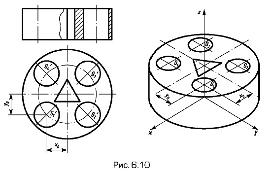 Пример построения в изометрической проекции круглого фланца с четырьмя цилиндрическими отверстиями и одним треугольным приведен на рис. 6.10. При построении осей цилиндрических отверстий, а также ребер треугольного отверстия использованы их координаты, например координаты х0 и y0.