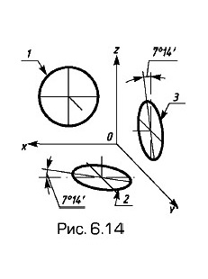 Окружности, лежащие в плоскостях, параллельных фронтальной плоскости проекций, проецируются на аксонометрическую плоскость проекций в окружность. Окружности, лежащие в плоскостях, параллельных горизонтальной и профильной плоскостям проекций,— в эллипсы (рис. 6.14). Большая ось эллипсов 2 и 3 равна 1,07, малая ось — 0,33 диаметра окружности. Пример косоугольной фронтальной диметрической проекции детали приведен на рис. 6.15.