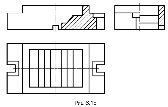 Аксонометрические проекции деталей Построение аксонометрических изображений деталейПоложение предмета в изометрической и диметрической проекциях выбирают в зависимости от его форм и соотношения размеров. Так, детали, имеющие продолговатую (удлиненную) форму, выполняют обычно в диметрии. При этом наибольший размер располагают вдоль осей х или z, по которым размеры не уменьшаются. В диметрии также предпочтительно выполнять детали, поверхности которых ограничены горизонтально-проецирующими или фронтально-проецирующими плоскостями, расположенными под углом 45° к плоскостям π2 и π1 соответственно, так как эти плоскости в изометрической проекции изображаются в виде вертикальных прямых. Внутренние формы деталей в аксонометрических проекциях выявляют «вырезом» передней части детали. Рациональная последовательность построения аксонометрической проекции по имеющемуся эскизу или чертежу (например, рис. 6.16.) такая: