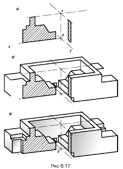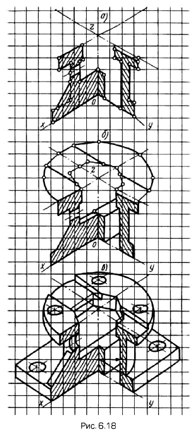 1) определяют вид аксонометрической проекции для изображения данного предмета (изометрия или диметрия). Деталь, показанную на рис. 6.16, целесообразно изображать в диметрической проекции (рис. 6.17). Выбирают достаточное место для аксонометрического изображения и отмечают начало координат О; 2) проводят аксонометрические оси под установленными углами (см. рис. 6.4 и 6.11) из начала координат и строят (рис. 6.17, а) сечения предмета в плоскостях yOz и xOz. Координаты точек сечений, выполняемых в плоскостях yOz и xOz, берут соответственно на профильном и фронтальном разрезах чертежа;