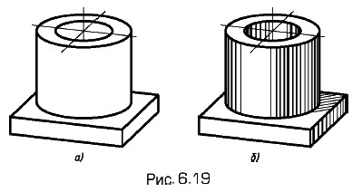 Аксонометрические проекции деталей Технические рисункиТехнический рисунок — это наглядное изображение, выполненное по правилам построения аксонометрических проекций (от руки или при помощи чертежных инструментов) с использованием светотени. Целями выполнения технического рисунка являются проверка умения студента читать тот или иной чертеж и закрепление навыков выполнения наглядных изображений. Выполнение наглядных изображений, особенно от руки, без предварительного построения аксонометрических проекций, развивает глазомер, пространственное представление о формах предмета, умение анализировать эти формы и наглядно их изображать. Особое значение технический рисунок получил в связи с внедрением в процесс конструирования требований технической эстетики. Выполнение технических рисунков, как правило, производят при съемке эскизов с натуры (рисунок выполняют от руки) и при деталировании чертежа общего вида (рисунок выполняют при помощи чертежных инструментов). В качестве основы технического рисунка в большинстве случаев применяют прямоугольные изо- и диметрические проекции, которые наряду с наглядностью достаточно просты по своему выполнению. Для построения наглядных изображений в диметрии лучше применять положение осей, предусматривающее «левую» систему координат (рис. 6.19, а, б). Светотень, являющуюся дополнительным средством передачи объема предмета, применяют для придания аксонометрическому изображению большей выразительности (рис. 6.19, б). Чтобы выполнять аксонометрические изображения предметов с учетом светотени, кратко познакомимся с основными правилами этих построений.