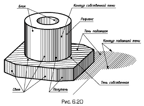 Светотенью называется распределение света на поверхности предмета. В зависимости от формы предмета лучи света, падая на него, распределяются по его поверхности неравномерно, благодаря чему светотень и создает выразительность изображения — рельефность и объемность. Можно отметить следующие элементы светотени (рис. 6.20): свет, полутень и тень (собственную и падающую). На затененной части имеется рефлекс, а на освещенной — блик.