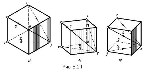Свет — освещенная часть поверхности предмета. Освещенность поверхности зависит от того угла, под которым падают на эту поверхность световые лучи. Наиболее освещенная поверхность та, которая расположена перпендикулярно к направлению лучей света. Полутень — умеренно освещенная часть поверхности. Переход от света к полутени на гранных поверхностях может быть резким, а на кривых — всегда постепенный. Последнее объясняется тем, что угол падения лучей света на соседние части изменяется также постепенно. Тень собственная — часть поверхности предмета, которую не достигают лучи света. Тень падающая появляется в том случае, если на пути лучей света расположить какой-либо предмет, который и отбрасывает на находящуюся за ним поверхность падающую тень. Рефлекс — высветление собственной тени за счет освещения теневой стороны предмета отраженными лучами от окружающих освещенных предметов или поверхностей данного предмета. На техническом рисунке светотень обычно изображают упрощенно. Предмет, как правило, изображают на условном фоне изолированно от окружающей обстановки; свет на предмете изображают светлым пятном, не учитывая зависимость освещенности частей предмета от угла падения лучей света и удаления от источника света. Пример такого упрощенного изображения светотени показан на рисунке 6.19, б. Иногда технический рисунок выполняют с еще большим упрощением: показывают только собственную тень, а падающую нигде не показывают. Такое упрощение сильно облегчает построение, но при этом теряется выразительность изображения. Таким образом, для выполнения светотени на рисунке необходимо знать законы построения теней. Каждая тень имеет свою геометрическую форму, построение которой можно выполнить, используя методы начертательной геометрии. Для построения контуров теней необходимо знать характер лучей света и их направление. При выполнении технических рисунков принято пользоваться солнечным освещением, когда лучи параллельны друг другу, а направление их сверху, слева направо. Такое направление соответствует естественному, когда свет на рабочее место падает с левой стороны. Для единообразия в построении лучи света обычно направляют по диагонали куба, как показано на рис. 6.21, где дано направление лучей света Sдля изометрической (рис. 6.21, а) и двух диметрических проекций с «правой» (рис. 6.21, б) и «левой» (рис. 6.21, в) системой координат.