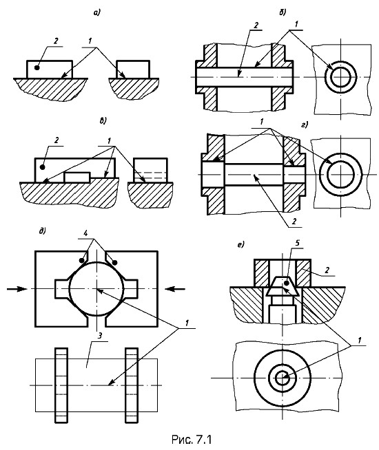 Изображение и обозначение элементов деталей Основные простые элементы деталейДеталь в изделии выполняет определенные функции. Это обеспечивается геометрической формой детали и физико-химическими свойствами материала детали. Они получаются в ходе технологического процесса изготовления детали. В геометрической форме детали выделяют конструктивные элементы, которые выполняют рабочие функции детали, и технологические элементы, которые обеспечивают изготовление детали. Конструктивные элементы являются основными. Кроме конструктивных и технологических элементов некоторые детали имеют информационные элементы, например таблички, надписи, указатели и т.п. Геометрическую форму простого элемента детали образует отсек одной поверхности, во многих случаях совпадающий с формами основных геометрических тел. Форму сложного элемента образуют два (или более) отсека поверхностей. Некоторые элементы, выполняющие разные функции, могут иметь одинаковую форму и одинаковые изображения с одинаково нанесенными размерами формы, положения и ориентации. Размеры формы элемента детали рекомендуется располагать на том изображении детали, на котором геометрическая форма элемента показана наиболее полно. Во многих случаях форму, положение и ориентацию элемента показывают на одном изображении. Однако в ряде случаев необходимо выполнить специальные изображения, чтобы показать положение и ориентацию элемента, а также нанести соответствующие размеры или в отдельных случаях только отклонения этих размеров. Размеры положения и ориентации элементов деталей наносят от основной или вспомогательной баз детали. Ими служат основной базовый элемент, на котором базируется сама деталь, или вспомогательные базовые элементы, являющиеся базами для других деталей. Выбираемый порядок простановки размеров тесно связан с теорией базирования, некоторые элементы которой и рассмотрим. Базированием называют придание заготовке или изделию требуемого положения, относительно выбранной системы координат. База — это поверхность или выполняющее ту же функцию сочетание поверхностей, ось, точка, принадлежащая заготовке или изделию и используемая для базирования. Примеры баз приведены на рис. 7.1, а — е, где 1 — база, 2 — деталь, 3 — заготовка, 4 — губки самоцентрирующих тисков, 5 — центрирующий конус приспособления. Базовые поверхности отмечены утолщенными линиями. На рис. 7.1 базами являются: а и б — поверхности (плоскость и цилиндр): в и г — сочетание поверхностей (двух параллельных плоскостей, двух соосных цилиндров); д — ось цилиндрической заготовки; е —точка (центр окружности в нижнем сечении цилиндрического отверстия в плоскости опорного торца). По характеру проявления базы подразделяют на скрытые и явные. Скрытая база — это база заготовки или изделия в виде воображаемой плоскости, оси или точки. Так, например, для кронштейна (см. рис. 5.44) скрытыми базами являются ось цилиндрической опорной поверхности диаметром 50 мм и фронтальная плоскость симметрии детали. Явная база — это база в виде реальной поверхности, разметочной риски или точки пересечений рисок. Явной базой у того же кронштейна (см. рис. 5.44) является опорная цилиндрическая поверхность диаметром 50 мм.