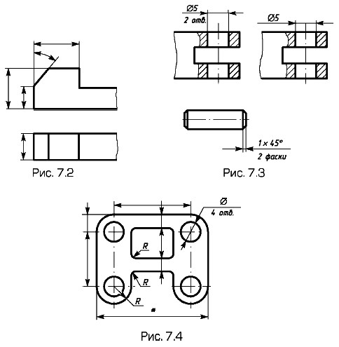 По назначению различают базы конструкторские, технологические и измерительные. Конструкторская база — это база, используемая для определения положения детали или сборочной единицы в изделии. Технологическая база — это база, используемая для определения положения заготовки или изделия в процессе изготовления или ремонта. Измерительную базу используют для определения относительного положения заготовки или изделия и средств измерения. В соответствии с рассмотренными понятиями о базах различают три системы простановки размеров: 1) от конструкторских баз; 2) от технологических баз; 3) комбинированную, в которой часть размеров ставят от конструкторских баз, другие — от технологических. Комбинированная система наиболее целесообразна, так как практически обычно от конструкторских баз требуется проставить небольшое количество размеров (10...20%). Эти размеры, влияющие на качество работы детали и прибора или машины в целом, выполняют с высокой точностью. Большую часть размеров проставляют от технологических баз в целях обеспечения простоты изготовления и измерения деталей. Следует отметить, что в ряде случаев конструкторские и технологические базы совпадают, например ось вращения для деталей, ограниченных соосными поверхностями вращения. Материализуют такую базу, например, с помощью центровых гнезд конической формы со стороны крайних торцов детали. Совмещение конструкторской и технологической баз, а также измерительной является одним из важных принципов конструирования — принципом единства баз. В рассмотренных выше чертежах деталей для размеров длин использована в основном вторая система простановки размеров от технологических баз. Простановка размеров от конструкторских баз будет рассмотрена ниже. Размеры формы элементаРазмеры, определяющие форму любого элемента, включая отверстия, следует наносить на том изображении детали, где эта форма показана наиболее полно, обязательно группируя все размеры в одном месте (рис. 7.2). Размеры одинаковых элементов наносят на изображении одного из них, а под полкой выносной линии указывают число элементов (рис. 7.3). Размеры формы и положения симметрично расположенных элементов (кроме отверстий) можно наносить только один раз без указания их числа (рис. 7.4).