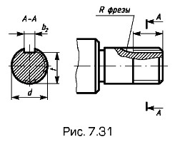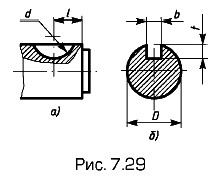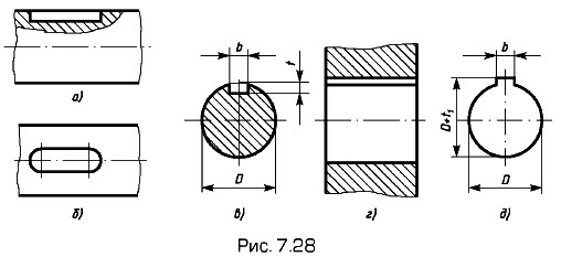 Линию пересечения боковых стенок паза с поверхностью вала или втулки заменяют на изображении проекцией крайней образующей поверхности вала или отверстия. Размеры шпоночных пазов для призматических и сегментных (рис. 7.29) шпонок на валу и втулке стандартизованы. Определяющим размером служат диаметр вала и втулки.