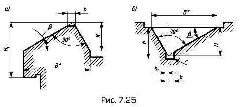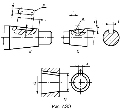Если шпоночные пазы необходимо выполнить на конических валу или втулке, то их изображения совпадают с изображениями пазов для цилиндрических вала и втулки. Только размер положения паза на валу наносят от меньшего основания конической части вала (рис. 7.30, а) и размер глубины паза в отверстии наносят в плоскости меньшего основания конической части отверстия (рис. 7.30, в). Эти размеры стандартизованы.