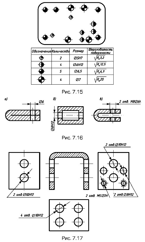 Выше были рассмотрены общие вопросы относительно размеров формы и расположения (см. рис. 7.3, 7.4, 7.6, 7.7). Здесь будут рассмотрены особенности изображения отверстий в основном под крепежные детали некоторых соединений и однотипные элементы.