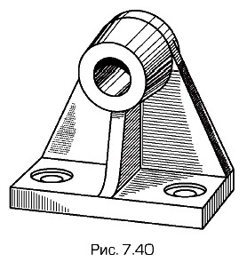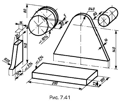 Изображение и обозначение элементов деталей Изображение элементов литых деталейЧтобы отлить какую-либо деталь, необходимо выполнить модель (деревянную или металлическую), стержневой ящик и чертежи к ним. Большинство литых деталей подвергают механической обработке. Поэтому на литых деталях проставляются размеры, необходимые для изготовления модели и стержневого ящика. При механической обработке литой детали на чертеже указывают размеры, связывающие обработанные и необработанные поверхности. При назначении размеров для изготовления модели рекомендуется мысленно расчленять модель на составные элементы и проставлять на них соответствующие размеры. Аналогично можно поступать с выбором размеров для изготовления стержневого ящика, выделяя элементы внутренней формы. Принцип простановки размеров рассмотрен на примере простой литой детали (рис. 7.40). Вариант расчленения детали на составные элементы показан на рис. 7.41: плита подшипника, стенка, ребро, тело подшипника в виде усеченного конуса и цилиндрическая бобышка. Два отверстия в плите сверлят, и поэтому в отливке они не предусмотрены. Отверстие в подшипнике из-за большого диаметра необходимо получить в отливке. Это отверстие ограничено цилиндрической поверхностью, поэтому стержень представляет собой цилиндр, изображенный справа.