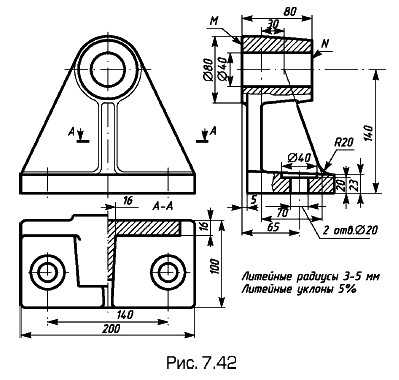 Для того чтобы модельщик не делал сложные пересчеты, на рабочем чертеже должны быть все размеры указанных элементов. Не обязательно, чтобы каждый размер, проставленный на рабочем чертеже, соответствовал размеру какого-либо элемента, но важно, чтобы размер элемента был ясен из рабочего чертежа и мог быть получен простым сложением или вычитанием. Размеры на чертеже даны без учета припусков на обработку и усадку металла, а также без учета конструкции самой модели: ее разъема, скрепления составных частей и др. При простановке размеров обработанные и необработанные поверхности детали должны быть связаны между собой размерами. При изготовлении детали отсутствие связи может привести к браку. На рис. 7.42 дан чертеж детали с размерами. Размер 80 связывает между собой обработанные поверхности M и N вдоль оси подшипника с необработанными. Размер 65 расположения отверстий в плите задан от обработанного торца M подшипника как размер от конструкторской базы.