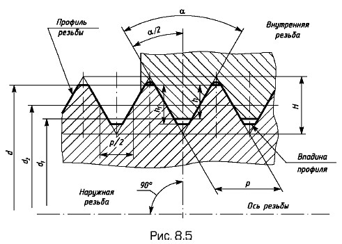 Изображение и обозначение резьбы и резьбовых соединений Основные параметры резьбы и ее изображение (продолжение)Основные параметры резьбыНа рис. 8.5 изображен профиль резьбы (сопряженных, свинченных внутренней и наружной резьб) и обозначены его основные параметры. Ось резьбы — прямая, относительно которой происходит винтовое движение плоского контура, образующего резьбу. Профиль резьбы — контур сечения резьбы в плоскости, проходящей через ее ось. В промышленности, как правило, применяют стандартные профили резьбы, некоторые из которых рассмотрены ниже. Детали с наружной резьбой трапецеидального и треугольного профиля — см. рис. 8.1, а, б. Боковыми сторонами профиля называют прямолинейные участки профиля, принадлежащие винтовым поверхностям. Участки профиля, соединяющие боковые стороны выступов или канавок, называют соответственно вершиной или впадиной профиля.