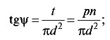 Из числа основных количественных параметров резьбы отметим: угол профиля α — угол между боковыми сторонами профиля; углы наклона боковых сторон профиля β; γ — углы между боковыми сторонами профиля и перпендикуляром к оси резьбы; для резьб с симметричным профилем углы наклона равны половине угла профиля α/2; рабочая высота профиля h — высота соприкосновения сторон профиля наружной и внутренней резьбы в направлении, перпендикулярном к оси резьбы: длина свинчивания — длина соприкосновения винтовых поверхностей наружной и внутренней резьбы в осевом направлении. Параметры, относящиеся только к цилиндрическим резьбам, следующие: высота исходного профиля Н — высота остроугольного профиля, полученного путем продолжения боковых сторон профиля до их пересечения (если профиль построен исходя из треугольника); высота профиля h1; шаг резьбы р — расстояние между соседними одноименными боковыми сторонами профиля в направлении, параллельном оси резьбы; ход резьбы l — расстояние между ближайшими боковыми сторонами профиля, принадлежащими одной и той же винтовой поверхности, в направлении, параллельном оси резьбы; ход резьбы есть величина относительного осевого перемещения винта (гайки) за один оборот; в однозаход- ных резьбах ход равен шагу, в многозаходных — произведению числа заходов п на шаг: t = р • n; угол подъема резьбы Ψ — угол, образованный касательной к винтовой линии в точке, лежащей на среднем диаметре резьбы, и плоскостью, перпендикулярной к оси резьбы, угол Ψ определяется зависимостью