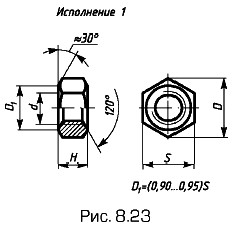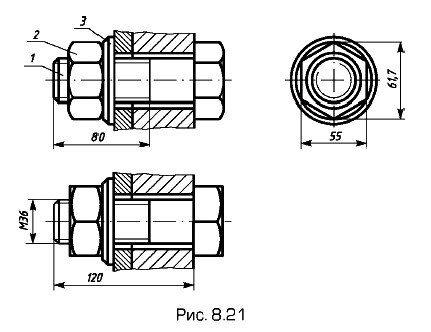 Обычно болты применяются для соединения деталей не очень большой толщины (фланцев и др.) и при необходимости частого соединения и разъединения деталей по условиям их эксплуатации. Выпускаемые промышленностью болты различают по форме и размерам головки, по форме стержня, по шагу резьбы, по характеру исполнения, по точности изготовления. В зависимости от назначения и условий работы болты выполняют с шестигранными, полукруглыми и потайными головками. На различные формы болтов разработаны и утверждены свои стандарты. Болты с шестигранными головками получили наибольшее распространение. Их изготавливают нормальной, повышенной и грубой точности, они имеют от трех до пяти вариантов исполнения. Вариант исполнения 1 приведен на рис. 8.22 Эти болты стандартизованы в ГОСТ 7798—70. Обычно их рекомендуют использовать и в учебном процессе. Стандартное условное обозначение болта, которое записывают в технической документации и применяют в литературе, содержит основные конструктивные размеры. Например, запись «Болт М12х60 ГОСТ 7798—70» обозначает, что болт имеет метрическую резьбу диаметром 12 мм с крупным шагом, длину стержня 60 мм, головку шестигранную, исполнение 1. Изображение болта такой же конструкции в соединении с другими деталями, с диаметром резьбы 36 мм с крупным шагом и длиной стержня 120 мм — см. рис. 8.21. Гайка — деталь, имеющая отверстие с резьбой для навинчивания на болт или шпильку (рис. 8.23). Гайки различают: по форме наружной поверхности; по виду исполнения; по типу резьбы; по точности изготовления.