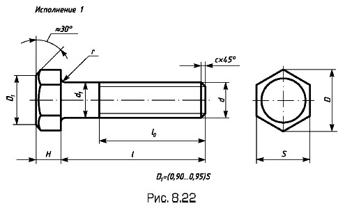 Болт (рис. 8.22) представляет собой цилиндрический стержень с резьбой на одном конце и головкой на другом (чаще всего в виде шестигранной призмы). При соединении скрепляемых деталей на резьбу болта навертывается гайка. Головку болта обрабатывают с торца на конус (этот элемент называют фаской). Фаску выполняют и на стержне для удобства нарезания резьбы и устранения непрочной части крайнего витка. Указанные фаски на рис. 8.22 заданы диаметром D1 и углом 30° на головке и обозначением с х 45° на стержне (с — величина фаски, обычно равна шагу p резьбы). Обозначение диаметра d на рис. 8.22 на чертежах болтов заменяют на обозначение резьбы.
