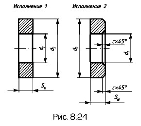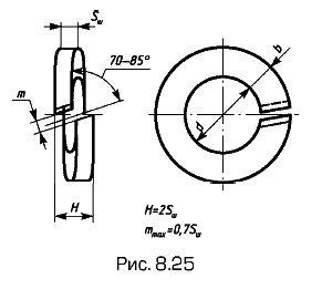 Шайбы разделяются на шайбы круглые, пружинные, стопорные и др. Шайбы круглые имеют несколько видов: шайбы обычные нормального ряда по ГОСТ 11371—78, шайбы увеличенные, шайбы уменьшенные. Шайбы нормального ряда имеют два исполнения: исполнение 1 без фаски, исполнение 2 с фасками (см. рис. 8.24). Пример условного обозначения шайбы для крепежной детали исполнения 1, диаметром 12 мм, установленной толщины, из материала группы 01, с покрытием 01 толщиной 9 мкм: Шайба 12.01.019 ГОСТ 11371-78. Для аналогичной шайбы, но исполнения 2 обозначение будет: Шайба 2.12.01.019ГОСТ 11371-78. Шайбы пружинные (ГОСТ 6402—70) предохраняют гайку от самоотвинчивания при толчках и сотрясениях (рис. 8.25).