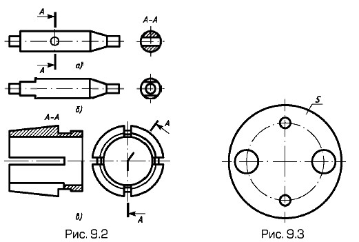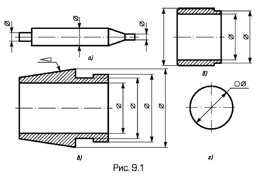 Указанные данные на чертеже деталей наносят после изучения курсов деталей машин и приборов, основ взаимозаменяемости, технических измерений и стандартизации, основ технологии. Поэтому в начертательной геометрии и инженерной графике изучают в основном правила выполнения чертежей деталей, относящиеся к изображению их формы на чертеже и нанесению номинальных размеров. Кроме того, указываются некоторые правила по обозначению предельных отклонений размеров, формы и расположения поверхностей, нанесения надписей, обозначения покрытий, видов обработки. Рассмотрим некоторые правила выполнения чертежей деталей, установленные в ГОСТ 2.109-73, с учетом специфики учебного процесса. Рабочие чертежи разрабатывают на каждую деталь. Допускается не выпускать чертежи на детали, изготавливаемые из фасонного или сортового материала отрезкой под прямым углом и из листового материала резкой по окружности или по периметру прямоугольника без последующей обработки, а также в некоторых других случаях, установленных стандартом. Выбор числа изображенийКоличество изображений предмета, в том числе и детали на чертеже или эскизе, должно быть наименьшим, но обеспечивающим полное представление о предмете при применении установленных соответствующих стандартных обозначений, знаков и надписей. Для деталей типа тел вращения достаточно одного изображения (рис. 9.1) на плоскости проекций, параллельной оси тела: вида (рис. 9.1, а, г), разреза (рис. 9.1, б, в) с указанием знаков 0 (окружность, перечеркиваемая под углом 60°) перед размерными числами диаметров. Одного изображения достаточно также для деталей типа валов, втулок с резьбой с обозначением резьбы. Для деталей типа тел вращения с различными конструктивными элементами, например отверстиями, срезами, пазами, главное изображение дополняют одним или несколькими видами, разрезами, сечениями, которые выявляют форму этих элементов, а также выносными элементами (рис. 9.2, а, б, в). Для тонких плоских деталей любой формы достаточно одного изображения. Толщину материала указывают на выносной полочке с указанием символа s толщины перед ее цифровым обозначением (рис. 9.3).