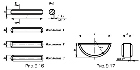Заклепки изготавливаются с полукруглой головкой (а) и с потайной головкой (б). Общие технические требования на заклепки, а также условные обозначения групп и марок материалов, виды и толщины покрытий установлены в ГОСТ 10304—80. В условном обозначении заклепок на чертежах указывают в следующем порядке: наименование, диаметр, длину, группу материала, марку материала, группу покрытия и номер стандарта на размеры. На учебных чертежах указывают диаметры и длину заклепки: Заклепка 5x16ГОСТ... ШпонкиШпонкой называется деталь, устанавливаемая в пазах соединяемых деталей для предотвращения и относительного перемещения при передаче крутящего момента. Преимущественно применяются при соединении валов со ступицей вращающихся деталей. Наиболее распространены призматические (рис. 9.16) и сегментные (рис. 9.17) шпонки. Сегментные шпонки рекомендованы только для неподвижных соединений.