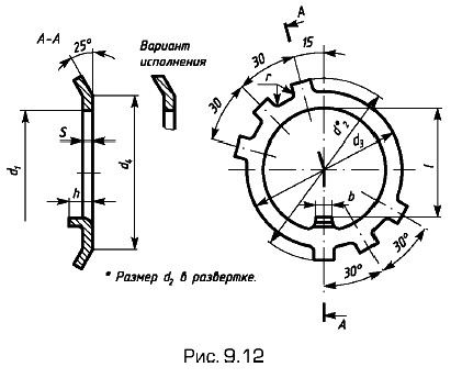 Рабочие чертежи деталей. Детали со стандартными изображениями Изображение стандартных деталей (окончание)Шайбы стопорные многолапчатыеШайбы стандартного ряда выпускаются до размера d1 = 200 мм и предназначены для стопорения круглых шлицевых гаек (рис. 9.12). При сборке внутреннюю отогнутую лапку устанавливают в продольный паз резьбового стержня, а одну из шайб наружных лапок отгибают в шлиц гайки.