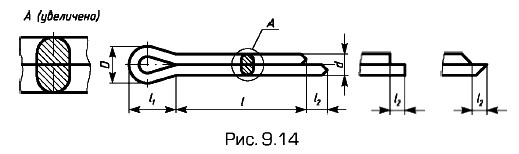 Шайбы с лапкой назначают для конструкций, в которых есть возможность отогнуть длинную лапку за край детали. Шайбы с носком используют для конструкций, в которых край детали расположен далеко от отверстия под крепежный элемент. Носок шайбы при сборке вводят в отверстие диаметром d1 и глубиной h, просверленное в детали. Разрезную лапку отгибают на грани гайки для ее фиксации в выбранном положении. ШплинтыИспользуются для предотвращения самоотвинчивания корончатых и шлицевых гаек и продольной фиксации деталей на гладких валах и осях (рис. 9.14).