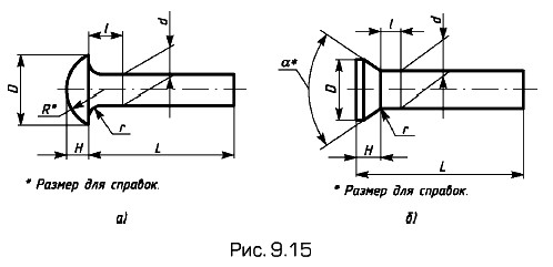 ЗаклепкиПрименяют для неразъемного соединения деталей, изготовленных из несвариваемых материалов или материалов, не допускающих нагрева при сварке, и др. Заклепка состоит из стержня и головки (рис. 9.15). Определяющими размерами заклепок являются диаметр d и длина l. Форму заклепки как тела вращения полностью передает одно изображение.